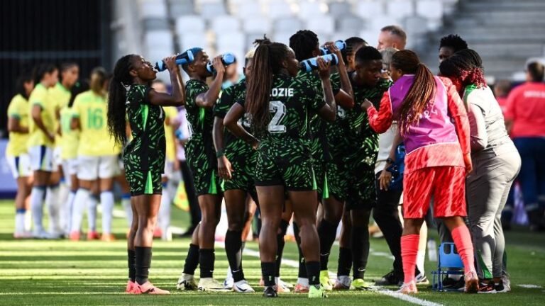 Hydration is important for athletes. Here, the Nigerian women’s soccer team takes a hydration break during a match against Brazil in Bordeaux, France, on July 25 during the 2024 Olympic Games.
