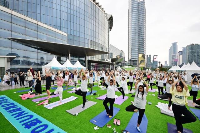 SEOUL, June 24 (AJU PRESS) — Despite heavy rain, 500 yoga practitioners and enthusiasts gathered at COEX, a huge underground shopping mall complex in southern Seoul’s Gangnam district, last Saturday to celebrate the 10th International Day of Yoga.