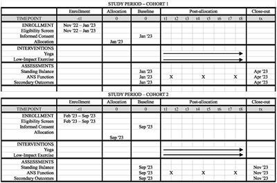 This study is being conducted within university laboratories and buildings for pre-and post-intervention assessments and interventions. All procedures are completed at a single site in the Mountain West subregion of the United States of America and described using SPIRIT reporting guidelines and checklist (Chan et al., 2013). The study consists of two participant cohorts: Cohort 1 and Cohort 2. A cohort design was selected to ensure small class sizes during yoga and control exercise sessions to support participant engagement, success, and safety. All study procedures for Cohort 1 and Cohort 2 are identical and the timeline of study components for both cohorts is depicted in Figure 1.